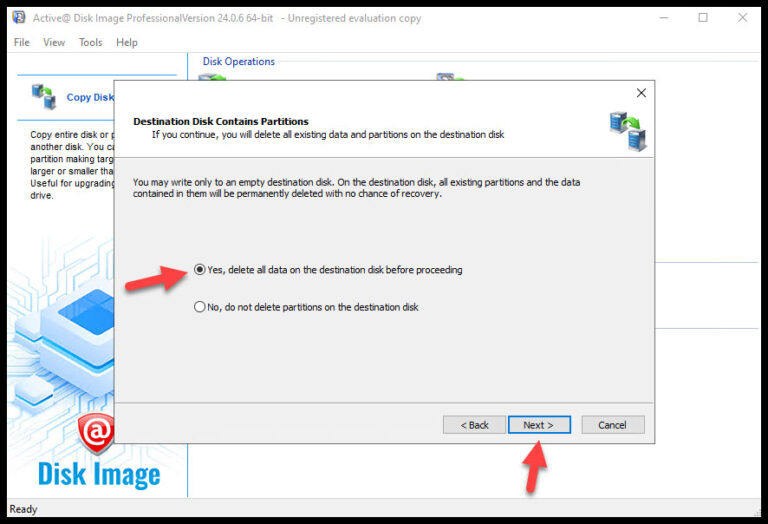 The next screen is important. We need to delete the data on the target disk. If you have the wrong disk EVERYTHING will be deleted. If you’re sure you have the correct disk choose Yes, then Next.