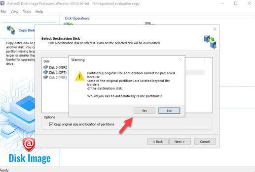 Before you proceed double-check to make sure you have the correct disks selected. Then choose Yes to resize partitions.